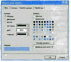 Відкриється однойменне вікно, в якому на закладці "Вид" (мал.17.10) необхідно в області "Заливка" обрати новий колір діаграми. Потім клацнути наприклад по ярко-зеленому кольорі, і область "Образец" змінить свій колір. Потім клацнути по кнопці "ОК".