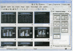 Для того щоб виконати доробку презентації в цілому, необхідно перейти до режиму "Сортировщик слайдов". У вікні PowerPoint відобразиться мініатюри всіх підготовлених вами слайдів (мал.21.1). Переглядаючи в одному вікні всі слайди презентації можна легко виявити помилки їх оформлення, можна виконати необхідні зміни.