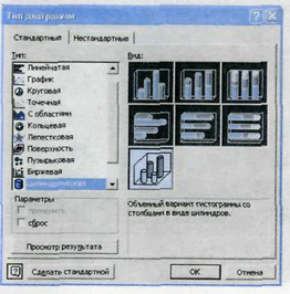 Клацнувши по кнопці (чорний трикутничок) інструменту "Тип диаграммы", відкриється вікно вибору типів діаграм (мал.17.7). Клацнувши по необхідному типі діаграми, можна швидко змінити зовнішній вид діаграми.