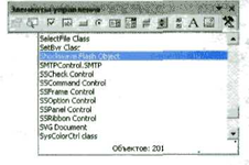 Для того щоб, вставити Флеш-анімацію потрібно клацнути правою кнопкою миші на панелі інструментів вікна PowerPoint і у відкритому контекстному меню встановити флажок "Элементы управления". Потім на відкритій панелі "Элементы управления" клацнути по кнопці "Другие элементы". Відкриється список, в якому необхідно обрати команду "ShockWave Flash Object" (мал. 20.1).
