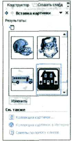 Також можна вставити зображення до любого слайду в не залежності від обраного типу авторозмітки. Для цього необхідно обрати в меню "Вставка" пункт "Рисунок" - "Картинки". Із правого боку в області задач відкриється вікно "Вставка картинки" (мал.18.4), в якому потрібно обрати необхідне зображення.