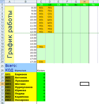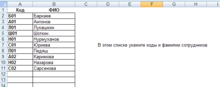 Ниже приведен пример анализа учета рабочего времени сотрудников офиса. В лист1 записаны коды и фамилии сотрудников, в лист2 расписаны рабочие время и занесены формулы подсчета количеств отработанных часов (Рис.3.1-3.2).