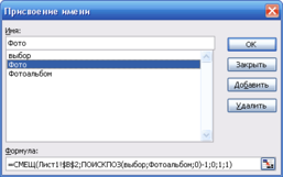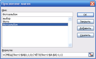 Теперь надо дать имя нашему списку, чтобы ссылаться на него в будущем. Идем в меню Вставка - Имя - Присвоить (Insert - Name - Define)(рис.3.4), вводим имя (например Фотоальбом) и в качестве адреса указываем: