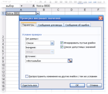 Перейдем на Лист 2 и создадим там ячейку с выпадающим списком для выбора пользователем модели телефона (пусть это будет A1). Выделяем ячейку и идем в меню Данные - Проверка (Data - Validation), далее в поле Допустимые значения выбираем Список, а в качестве Источника указываем наш Фотоальбом: