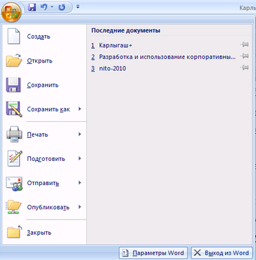Структура и функциональность меню Office 2007 отличается от меню Файл предыдущих версий Microsoft Office (см. приложение). Меню состоит из двух панелей, на левой панели отображаются группы команд для работы с файлами, а на правой панели – список команд, содержащихся в выделенной группе команд. В нижней области меню расположена кнопка Параметры для настройки приложения [30].