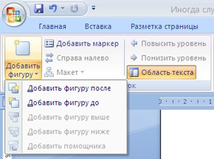 Еще один способ – использование кнопки «Добавить фигуру». При этом в объект SmartArt добавятся элементы того же уровня, что и выделенный. Пункты «Добавить фигуру выше» и «Добавить фигуру ниже» предназначены для вставки элемента другого уровня (Рис. 23). Если какие-то кнопки неактивны, значит добавление нового элемента невозможно.