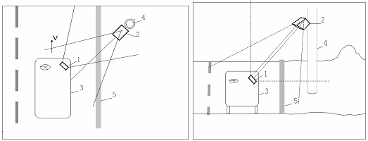 1-УПЕ; 2-АКП; 3-ПЕ; 4-столб; 5-бордюр дороги; V-вектор скорости ПЕ.