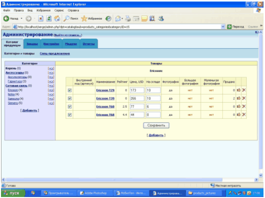 Режим администрирования – Каталог продукции. Здесь можно добавить, удалить или отредактировать данные продуктов. Что бы добавить новый телефон или аксессуар необходимо щелкнуть по ссылке "Добавить". Чтобы удалить нужный товар необходимо напротив этого товара нажать на красный крестик. Чтобы отредактировать товар необходимо нажать на название этого товара. Для того чтобы выйти из режима администрирования нужно нажать на ссылку "выйти из сеанса" (рисунок 3.8).