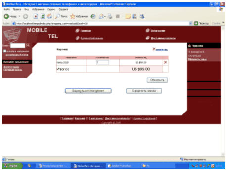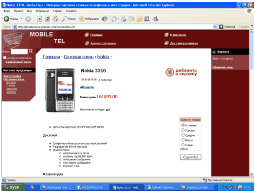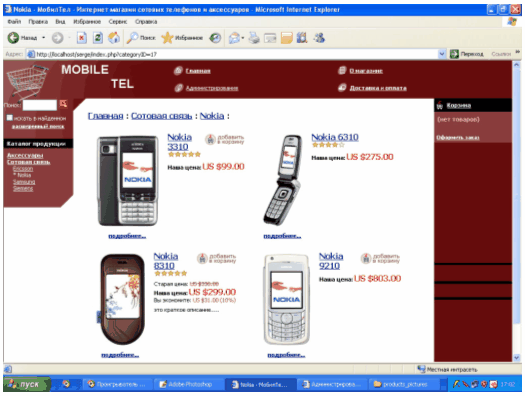 Выбрав раздел, например Сотовая связь – Nokia, посетитель попадает на страницу, где представлены все телефоны марки Нокиа с указанием цен. Чтобы заказать нужный телефон, необходимо нажать на ее картинке или названии, и тогда эта модель попадает в "покупательскую корзину"(рисунок 3.2).