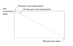 Натискаємо і утримуємо ліву кнопку миші. Переміщаючи мишу, вибераємо положення протилежного по діагоналі кута прямокутника. Для завершення малювання прямокутника відпускаємо кнопку миші.