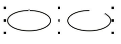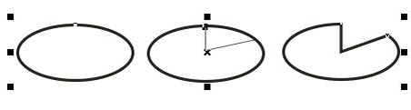 Натискаємо ліву кнопку миші, не відпускаючи її, починаємо пересувати мишу, не виводячи курсор миші за кордон еліпса. Замість одного вузла з'являться два, причому один почне пересуватися разом з мишею. Обидва узда будуть сполучені з центром еліпса (Рис. 6.5, в центрі). Відпускаємо кнопку миші, і з еліпса вийде сектор (Рис. 6.5, праворуч). Перетягнемо новий вузол назад, щоб він об'єднався з верхнім вузлом. Знову отримали еліпс.