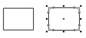 Поки не розгрупувати їх, нічого з ними зробити не можна, а після розгрупіровки можна округляти кути кожного прямокутника. За допомогою інструменту "Restangle Tool" панелі Toolbox (Графіка) малюємо прямокутник на вільному місці робочої області вікна програми. Підводимо покажчик миші до одного з вузлів, розташованих у вершинах прямокутника і зазначених маленькими рамками. Покажчик прийме інший вигляд (Рис. 6.3, ліворуч). Тепер можна перемістити вузол. Натискаємо ліву кнопку миші, не відпускаючи її, починаємо пересувати мишу. Разом з покажчиком миші почнуть пересуватися вузли, причому кожен з них подвоїться (Рис. 6.3 праворуч).