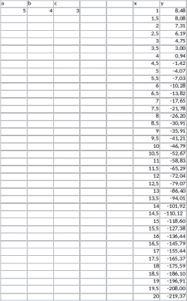 Исходные данные - константы a=5, b=4, c=3, находятся в ячейках A1, B1, C1, соответственно. Начальное значение x , должно находиться в ячейке F1. В ячейку G1 ввести формулу,