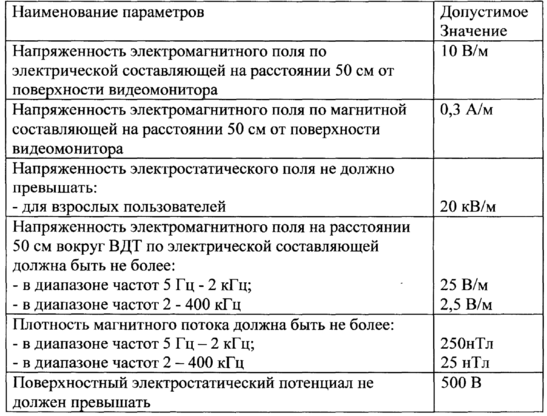 Может возникнуть опасность по уровням напряженности электромагнитного поля. На расстоянии 5-10 см от экрана и корпуса монитора уровни напряженности могут достигать 140 В/м по электрической составляющей, что значительно превышает допустимые значения СанПиН 2.2.2. 542-96. Предельно допустимые значения характеристик ЭМП (Таблица 7.5).