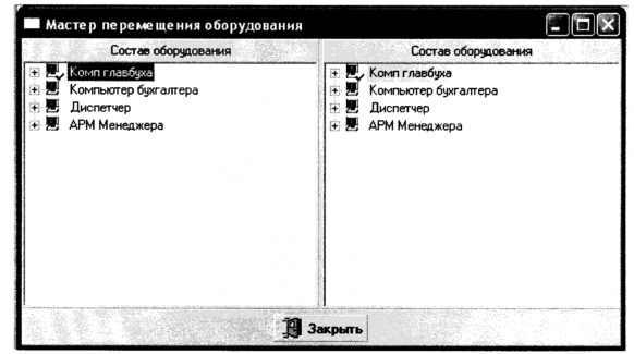 Перемещения элементов (Рисунок 5.7) представляет собой окно с левой и правой панелью. Обе панели отображают идентичные деревья, в которых представлены компьютеры и входящие в их состав элементы, для наглядности все элементы снабжены иконками. Окно мастера перемещения вызывается выбором подпункта «Перемещение элементов» пункта «Учет компьютеров» главного меню или нажатием соответствующей кнопки в панели быстрого доступа.