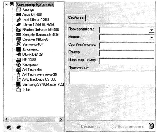После ввода условий покупки и нажатии кнопки «Принять» вызывается окно структуры компьютера, где пользователь должен ввести данные по покупке и состав и свойства элементов компьютера.