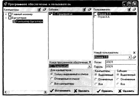 Для добавления пользователя программного обеспечения нужно выбрать нового пользователя. Поля «Логин» и «Пароль» предназначены для ввода данных о входе пользователя в систему. Опции «Компьютеры» и «SoftWare» определяют для каких программ и на каких компьютерах вводится новый пользователь с указанным логином и паролем. Для регистрации пользователя следует нажать кнопку «Принять». Для удаления пользователя или нескольких отмеченных пользователей для программного обеспечения и для компьютеров следует нажать кнопку «Удалить». Следует отметить, что возможность отмечать компьютеры и программы галочками позволяет очень быстро ввести нового пользователя программного обеспечения на несколько компьютеров, а также для нескольких программ сразу.