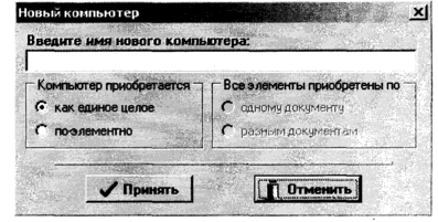 В зависимости от выбранного варианта покупки группировка элементов будет происходить по-разному. Если выбран вариант покупки «Компьютер целиком», то будет предложено сначала ввести документ, по которому куплен компьютер, а все вновь добавляемые элементы будут отнесены к этому документу.