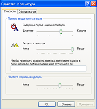 Вкладка Скорость позволяет регулировать скорость повтора символа при нажатой клавише. Передвижение с помощью мыши ползунка в верхней части окна регулирует интервал перед началом повтора символов, а центрального ползунка – скорость повтора символов при нажатой клавише. Третий ползунок в нижней части вкладки регулирует скорость мерцания курсора, отмечающего положение точки ввода.