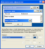 Если пользователя не устраивает ни один из предлагаемых стандартных вариантов цветового решения, можно создать свой вариант или изменить один из предлагаемых вариантов. Для этого следует нажать на кнопку Дополнительно, в результате чего появится диалоговое окно настройки цветовой схемы. Затем следует поочередно выбирать в раскрывающемся списке Элемент те элементы экрана, для которых нужно изменить цвета и другие атрибуты. Например, для рабочего стола можно задать только цвет, а для строки меню – цвет и ширину самой строки, размер и начертание шрифта для надписей, а также его цвет.