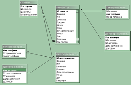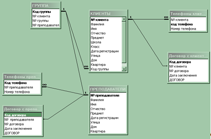 осуществляется аналогично связи таблиц “ ПРЕПОДАВАТЕЛИ” и “ ТЕЛЕФОНЫ ПРЕПОДАВАТЕЛЕЙ”, в каждой группе находится множество клиентов, в то время как один отдельный клиент не может находиться в нескольких группах: связь “один-ко-многим”.