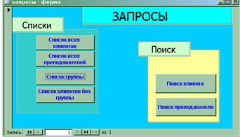 Следующая группа кнопок ЗАПОСЫ и ОТЧЁТЫ. При нажатии на кнопку ЗАПРОСЫ открывается кнопочная форма с одноимённым названием.