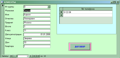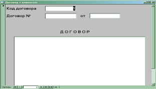 Форма КЛИЕНТЫ предназначена для занесения данных о новых клиентах и внесения изменений в уже существующих записях. Кроме того, на ней имеется кнопка “ДОГОВОР”, при нажатии на которую открывается форма “Договор с клиентом”. Обе формы представлены на рисунке 24.