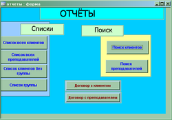 Данная форма (ОТЧЁТЫ) является практически зеркальным отражением формы ЗАПРОСЫ, с той лишь разницей, что при нажатии на кнопки этой формы открываются отчёты.
