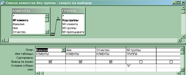 Рисунок 21 - Запрос “Список клиентов без группы” в режиме конструктора