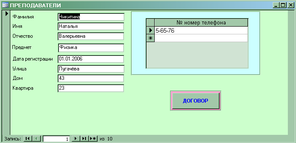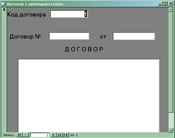 Форма ПРЕПОДАВАТЕЛИ предназначена для внесения данных о преподавателях. Кроме того, на ней имеется кнопка “ДОГОВОР”, при нажатии на которую открывается форма “Договор с преподавателем”. Обе формы представлены на рисунке 25.