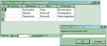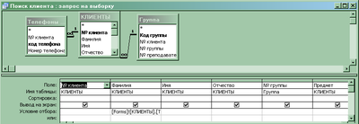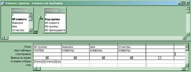 На результат выполнения запроса установлено условие отбора по номеру группы- [Forms]![отчеты]![группа].[Text]. Таким образом осуществляется проверка клиентов находящихся в одной группе.