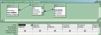 Для того, чтобы получить эти данные, и был создан запрос “Список всех клиентов” на основе трёх таблиц, в которых хранятся эти данные: “Клиенты” , “Телефоны клиентов” и “Группа”.