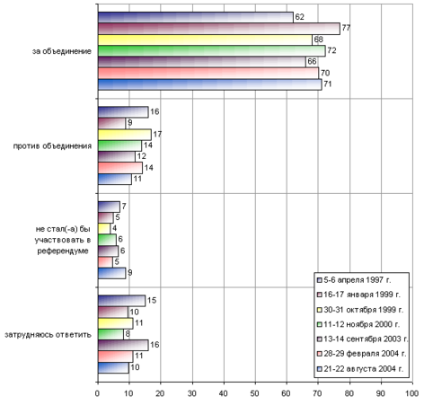 Вопрос: "Если бы сегодня проводился референдум по вопросу объединения Белоруссии и России, то Вы лично проголосовали бы за объединение или против объединения?"