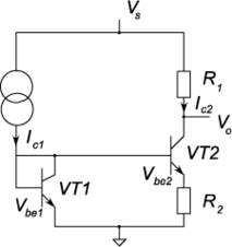 На рисунке 2.2 показана простая термочувствительная схема, используемая для получения выходного напряжения, пропорционального абсолютной температуре. Для идентичных кремниевых транзисторов VT1и VT2 пренебрегая их базовыми токами по сравнению с токами коллекторов, получаем