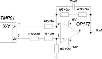 Из множества применяемых датчиков для измерения температур для проектируемой системы с учетом требований, изложенных в техническом задании (область применения системы, ее точностные характеристики, диапазон рабочих температур) в качестве датчиков наиболее целесообразным видится использование интегральных измерителей температуры. Они имеют гарантированные по ТУ характеристики (п.2), компактны и недороги [5]. Наиболее приемлемыми с этой точки зрения являются датчики фирмы Analog Devices ТМР01. Для них разработана «фирменная» схема включения, обеспечивающая низкочастотную фильтрацию и усиление сигнала (рисунок 4.1.1).