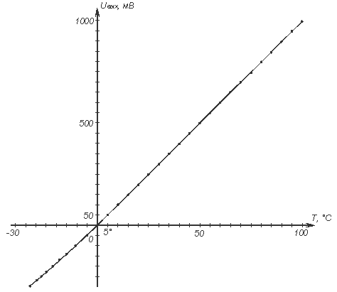 Построение градиировочной кривой подтвердило, что для применяемых датчиков зависимость выходного напряжения от измеряемой температуры носит линейный характер. Некоторая нелинейность (неотображаемая на графике и лежащая в пределах 0,5 – 2%) объясняется погрешностями измерительной аппаратуры.