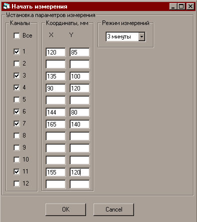 После выбора команды «Начать» пользователю открывается форма, представленная на рисунок 5.2.3, в которой выбираются требуемые для измерения каналы, а также режим (время) измерения.