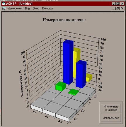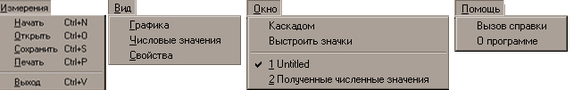 Главное меню управляющей программы состоит из четырех пунктов: «Измерения», «Вид», «Окно», «Помощь», для выбора которых определены соответствующие клавиши доступа (
