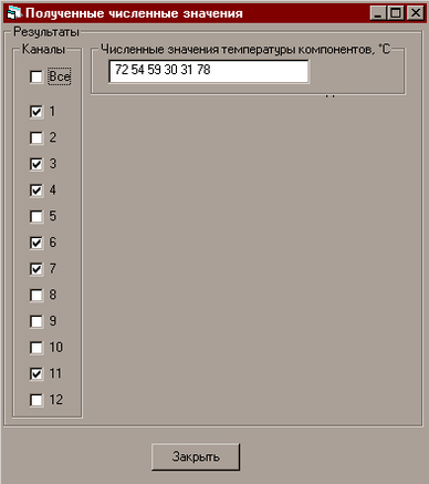 По нажатию кнопки «Численные значения» открывается форма, на которой отображаются численные значения полученных экспериментальных данных и номера каналов, по которым производились измерения (рисунок 5.4.6).