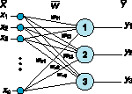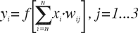 Параллелизм обработки достигается путём объединения большого числа нейронов в слои и соединения определённым образом различных нейронов между собой. В качестве примера простейшей НС приведём трёхнейронный персептрон (рисунок 1.1.-3), нейроны которого имеют активационную функцию в виде единичной пороговой. На n входов поступают некие сигналы, проходящие по синапсам на 3 нейрона, образующие единственный слой этой НС и выдающие три выходных сигнала: