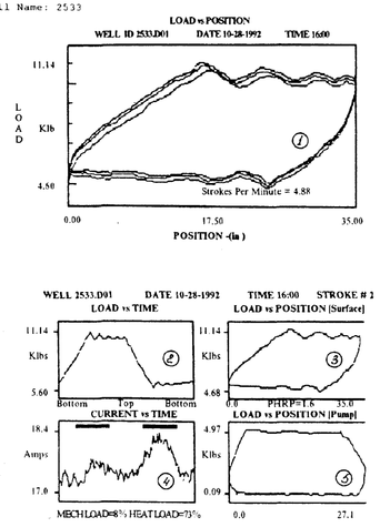 В обоих случаях для определения перемещения полированного штока используется очень компактный акселерометр на интегральной схеме, который встроен в датчик измерения нагрузки. Таким образом, необходим только один кабель для соединения компьютера и датчика нагрузки. Скорость движения полированного штока является результатом интегрирования сигнала ускорения акселерометра, а повторное интегрирование дает значение положения полированного штока как функции времени. Благодаря высокой скорости обработки информации компьютером, применяемым в комплексе систем "Анализатор", данные динамометрии появляются на экране сразу по мере измерения. В отдельном окне представляется график потребления электрического тока двигателем станка-качалки: анализ потребления электрического тока дает представление об уравновешенности станка-качалки.