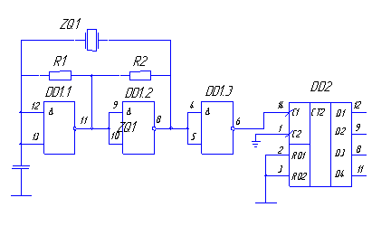 Генератор выполнен по схеме автогенератора на логических элементах DD1.1,DD1.2,DD1.3, выполнен на микросхеме К155ЛА3 c кварцевой стабилизацией частоты, кварцевый резонатор ZQ1 с резонансной частотой 80000 кГц.