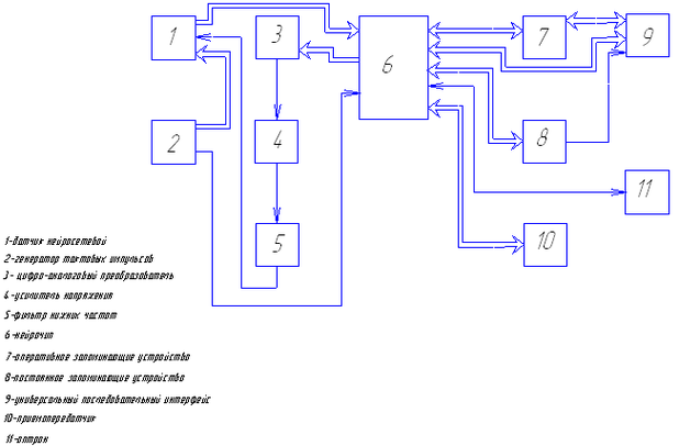 Генератор тактовых импульсов состоит из генератора, выполненного по схеме автогенератора на логических элементах с резонансной частотой 80000 кГц и счетчика-делителя частоты на 3, устраняющий фазовую нестабильность. Генератор тактовых импульсов тактирует импульсы для работы нейросетевого датчика и нейрочипа.Перед началом работы система производит самодиагностику, выполняя проверку блока обработки информации нейросетевого датчика с помощью таких блоков, как цифро-аналоговый преобразователь, усилитель напряжений и фильтр нижних частот. Самодиагностика заключается в следующем : нейрочип выдает кодовую комбинацию на цифро-аналоговый преобразователь, далее цифровой сигнал преобразуется в аналоговый сигнал. Выходное напряжение цифро-аналогового преобразователя равно 5 В, а входное напряжение аналого-цифрового преобразователя, расположенный в нейросетевом датчике равно 5 В, поэтому на выходе цифро-аналогового преобразователя расположен усилитель напряжений. Далее усиленный до необходимого уровня напряжения аналоговый сигнал поступает на фильтр нижних частот, где сигнал фильтруется от помех.И если кодовая комбинация с выхода нейрочипа совпадет с кодовой комбинацией на выходе аналого-цифрового преобразователя, то значит блок обработки информации в нейросетевом датчике исправен и система начинает работу. Цифровой сигнал с датчика поступает на нейрочип, где происходит обработка и сравнение полученных данных с эталонными значениями, записанных в постоянном запоминающем устройстве.Если данные совпадают, то результат записывается в оперативное запоминающее устройство. Если результаты не совпадают, то нейрочип выдает логический ‘0’ на вход устройства отключения электродвигателя, который выполнен на оптроне АОУ103. Его работа заключается в следующем, если станок-качалка находится в нормальном режиме работы, то на входе оптрона логическая ‘1’ светодиод и тиристор работают и в магнитном пускателе реле замкнуто, то есть электродвигатель работает. Если возникает какая-либо неисправность, то то нейрочип выдает логический ‘0’ на вход оптрона и светодиод и тиристор отключаются, и реле размыкается, электродвигатель останавливается. Параллельно информация поступает через универсальный последовательный интерфейс на пульт оператора, где по полученным значениям выстраивается динамограмма, характеризующая работу ШГНУ. И по полученной динамограмме оператор анализирует какой вид неисправности произошел.Оператор также может вносить изменения в работу системы через универсальный последовательный интерфейс или через устройство беспроводной передпчи данных.