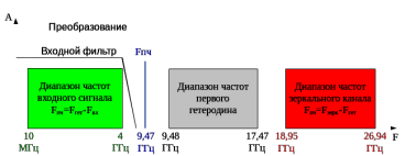 При первом преобразовании частоты используется высокая промежуточная частота (Fпч1 = 9470 МГц), что позволяет подавить частоты зеркального канала (Fзерк = 18,95 ГГц - 26,94 ГГц) ФНЧ с фиксированной настройкой, без влияния на анализируемый входной сигнал (см. рисунок 5.3).