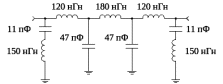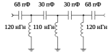 В качестве ФНЧ 5 ГГц используется фильтр, произведенный фирмой “Микран”. Этот фильтр специально разработан для работы в составе блока РПТ-04. В качестве ППФ 9470 МГц и ППФ 1070 МГц используются керамические фильтры, настроенные соответственно на частоты 9470 МГц и 1070 МГц, также произведенные фирмой “Микран”. ФВЧ 50 МГц и ФНЧ 100 МГц представляют собой LC фильтры. Схемы ФВЧ и ФНЧ представлены на рисунках 5.7 и 5.8 соответственно.