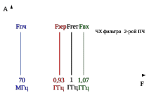 При третьем преобразовании частоты, сигнал переносится на третью промежуточную частоту (Fпч3 = 70 МГц). Частота зеркального канала (Fзерк3= 930 МГц) подавляется полосовым фильтром второй промежуточной частоты (см. рисунок 5.5).