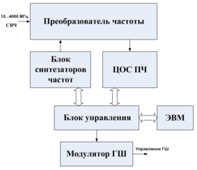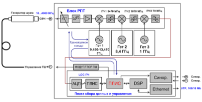 Преобразователь частот осуществляет перенос спектра шумового сигнала из входного диапазона 0,01…4 ГГц на промежуточную частоту, в блоке производится необходимое усиление и фильтрация сигнала. В качестве сигналов гетеродинов используются сигналы из блока синтезаторов частот. В блоке цифровой обработки (ЦОС ПЧ) сигнал оцифровывается, фильтруется и детектируется. Блок управления предназначен для управления работой блоков ЦОС ПЧ, синтезаторов частот, модулятора ГШ и обмена данных с ЭВМ. ЭВМ обеспечивает панорамное отображение результатов измерений и выполняет ряд вычислительных функций. Модулятор ГШ используется для управления полупроводниковым генератором шума, а также для обеспечения питания ГШ стабилизированным напряжением.