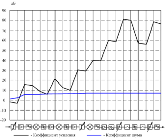 Результаты расчетов собственного коэффициента шума и коэффициента усиления всего радиоприемного тракта в программе СВЧ - моделирования Microwave Office 2004 представлены на рисунке 5.8.