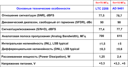 При выборе АЦП важно учесть такие характеристики как: разрядность, частота дискретизации, SINAD, SNR, SFDR, наличие управляемых логических входов (Dither, Randomizer, PGA - усилитель с программируемым коэффициентом усиления), а также обратить внимание на их цену и доступность. Analog Devices и Linear Technology - мировые лидеры в производстве интегральных схем (ИС) для преобразования сигналов. ИС AD9461 и LTC2208 - первые представители нового семейства быстродействующих 16-битных АЦП, обеспечивающие высокую максимальную частоту дискретизации 130 МГЦ, удобные в применении, имеющие высокие динамические характеристики и при этом весьма конкурентоспособную цену.