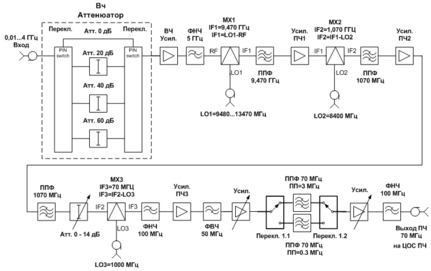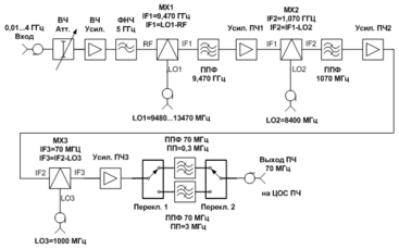 Для преобразователя частоты выбрана супергетеродинная схема с тройным преобразованием частоты, аналогичная примененной в преобразователе частот ИКШ фирмы Agilent. При первом преобразовании частоты используется высокая промежуточная частота (Fпч1 = 9470 МГц), что позволяет подавить частоты зеркального канала (Fзерк = 18,95 ГГц - 26,94 ГГц) ФНЧ с фиксированной настройкой. При втором преобразовании частоты, сигнал переносится на более низкую промежуточную частоту (Fпч2 = 1070 МГц). Частота зеркального канала (Fзерк2 = 7,33 ГГц) подавляется полосовым фильтром первой промежуточной. При третьем преобразовании частоты, сигнал переносится на третью промежуточную частоту (Fпч3 = 70 МГц). Частота зеркального канала (Fзерк3= 930 МГц) подавляется полосовым фильтром второй промежуточной частоты